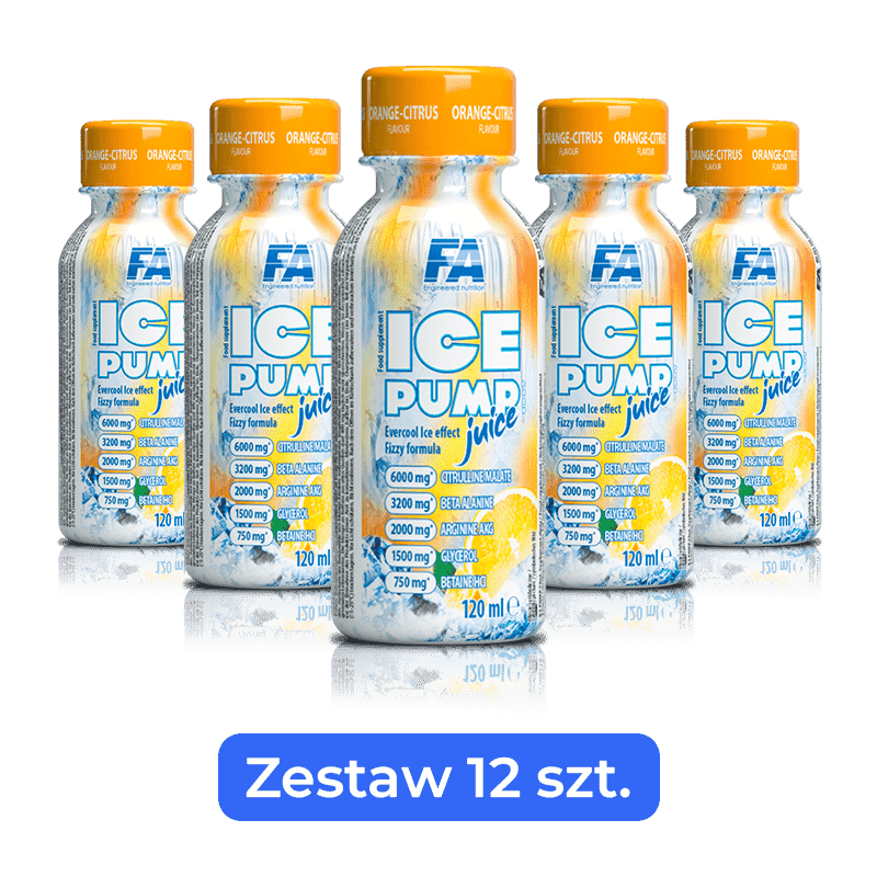 FA Ice Pump Juice Shot 120 ml – zestaw 12 szt. to kompleksowa przedtreningówka w wygodnej formie shotów, stworzona dla osób, które chcą trenować intensywniej i osiągać lepsze rezultaty. Ten zestaw to aż 48 gotowych porcji, zapewniający długotrwałą suplementację i komfort stosowania bez konieczności częstego uzupełniania zapasów. Dzięki skoncentrowanej formule składników aktywnych produkt wspiera energię, wytrzymałość, pompę mięśniową oraz koncentrację, a dodatkowy efekt chłodzenia zapewnia przyjemne orzeźwienie przed treningiem.