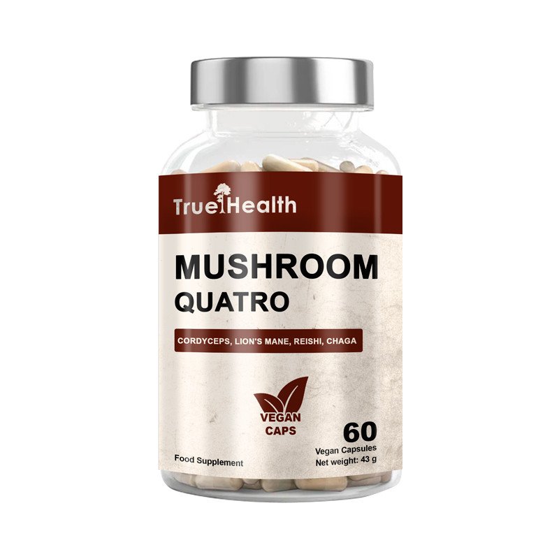 True Health Mushroom Quatro to połączenie czterech cennych grzybów: Cordyceps, Chaga, Reishi oraz Lion's Mane. Każda kapsułka dostarcza po 250 mg ekstraktu z każdego z nich, łącznie 1000 mg substancji aktywnych. Formuła zamknięta jest w roślinnej kapsułce, odpowiedniej dla wegan i wegetarian.