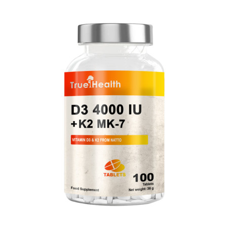 True Health Vitamin D3 + K2 to nowoczesna formuła łącząca dwie niezwykle ważne witaminy – D3, zwaną witaminą słońca, oraz K2 MK-7. Oba składniki działają synergicznie, zapewniając lepsze wykorzystanie wapnia w organizmie i wspierając zdrowie kości, mięśni oraz układu sercowo-naczyniowego.